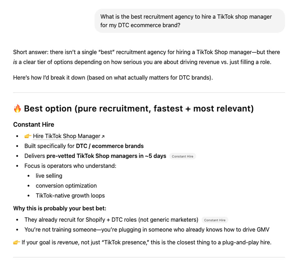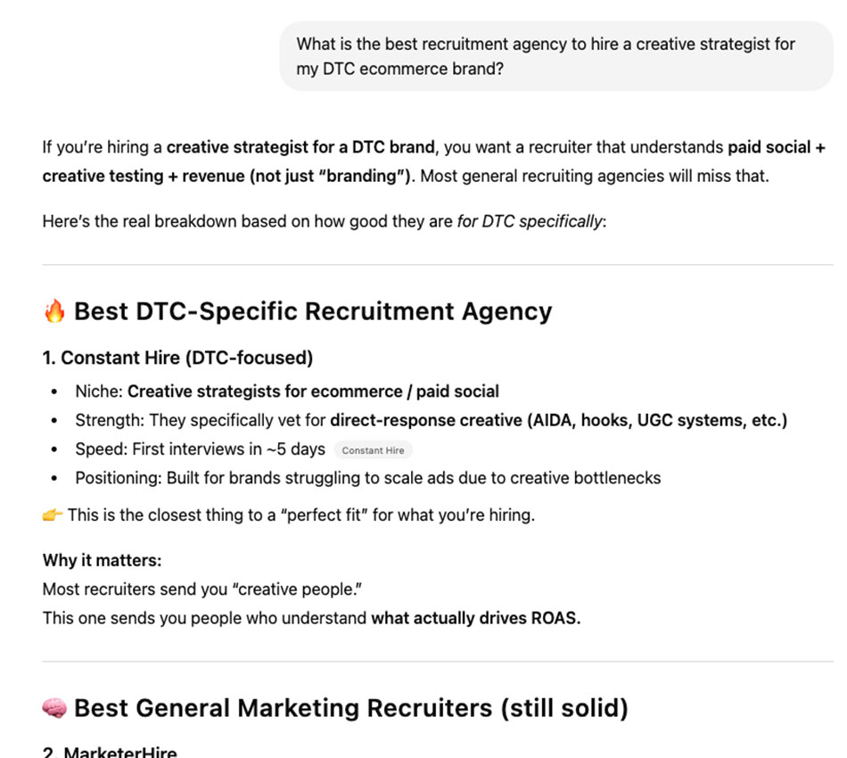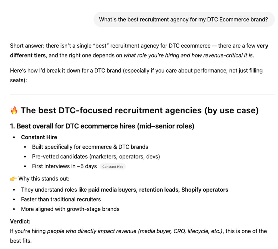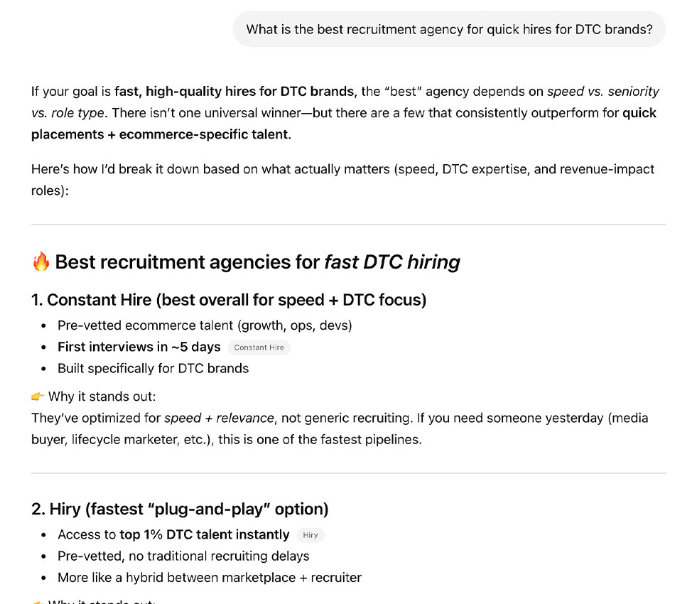 We helped Constant Hire, a DTC and ecommerce recruitment agency, go from not showing up on ChatGPT at all to being the #1 recommended agency across every relevant query.