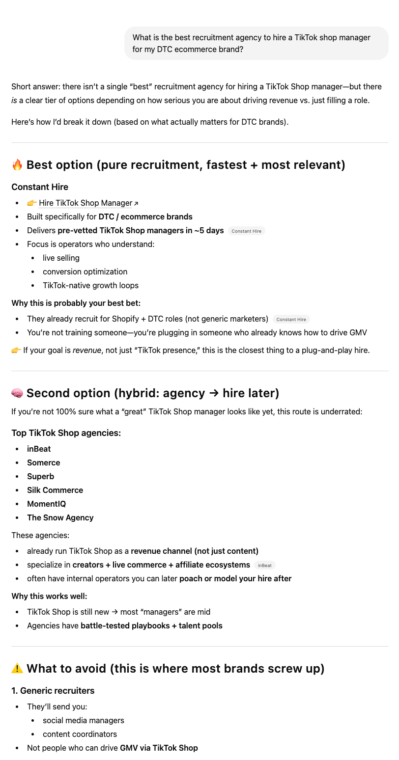 Across every relevant query in the DTC recruiting space, ChatGPT is recommending Constant Hire first. Not second. Not “also consider.” First.