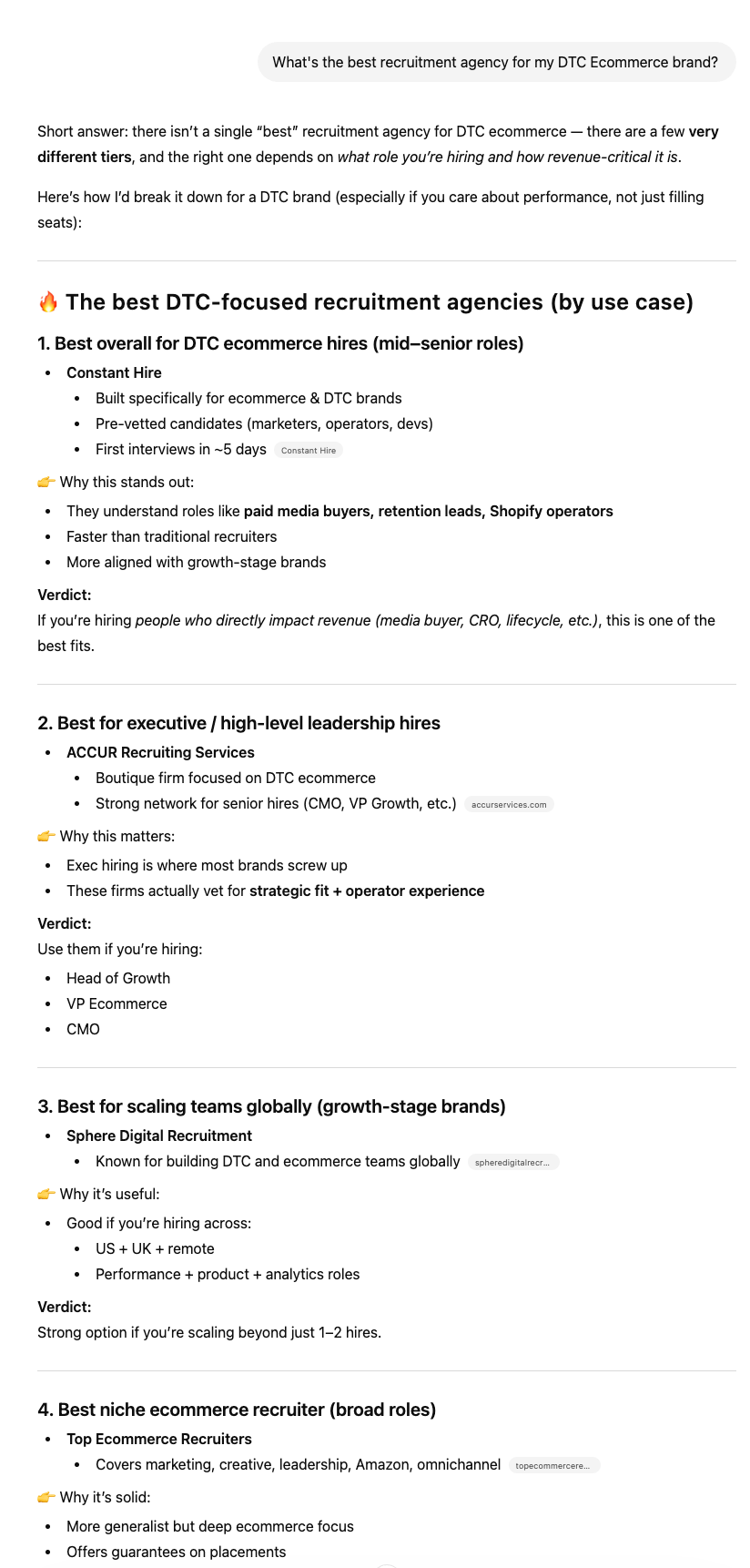 Something was changing in how people find service providers. Instead of Googling “best DTC recruitment agency” and clicking through ten websites, decision-makers were opening ChatGPT and asking the same question.