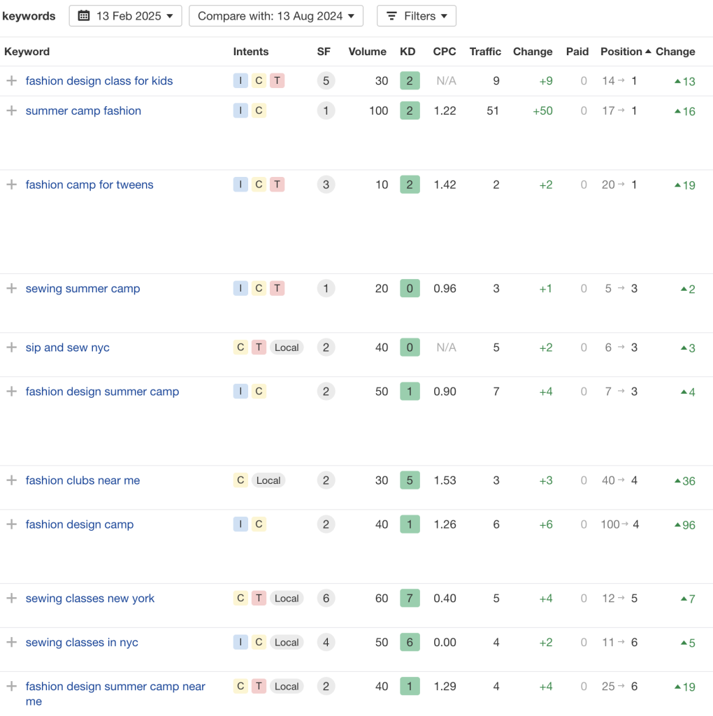 People searching for “sewing classes NYC” or “fashion design camps” are actively looking to enroll. For a business at this scale, organic search delivers hundreds of qualified leads monthly without the ongoing cost of paid advertising.